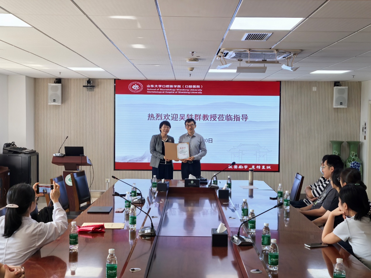 近日,上海交通大学医学院附属第九人民医院口腔第二门诊部主任吴轶群教授来院进行学术交流,并指导我院国家临床重点专科(牙周病科)建设。学院(医院)院长葛少华出席会议,牙周病科主任宋爱梅、种植科主任兰晶及部分牙周病科、种植科医务人员参加会议。