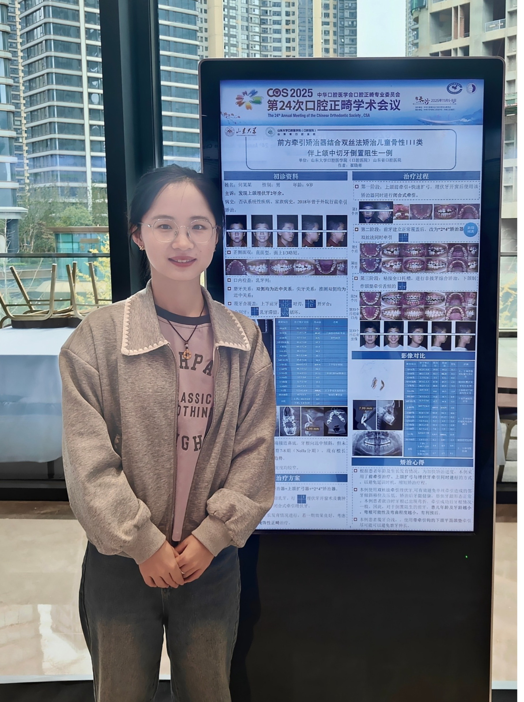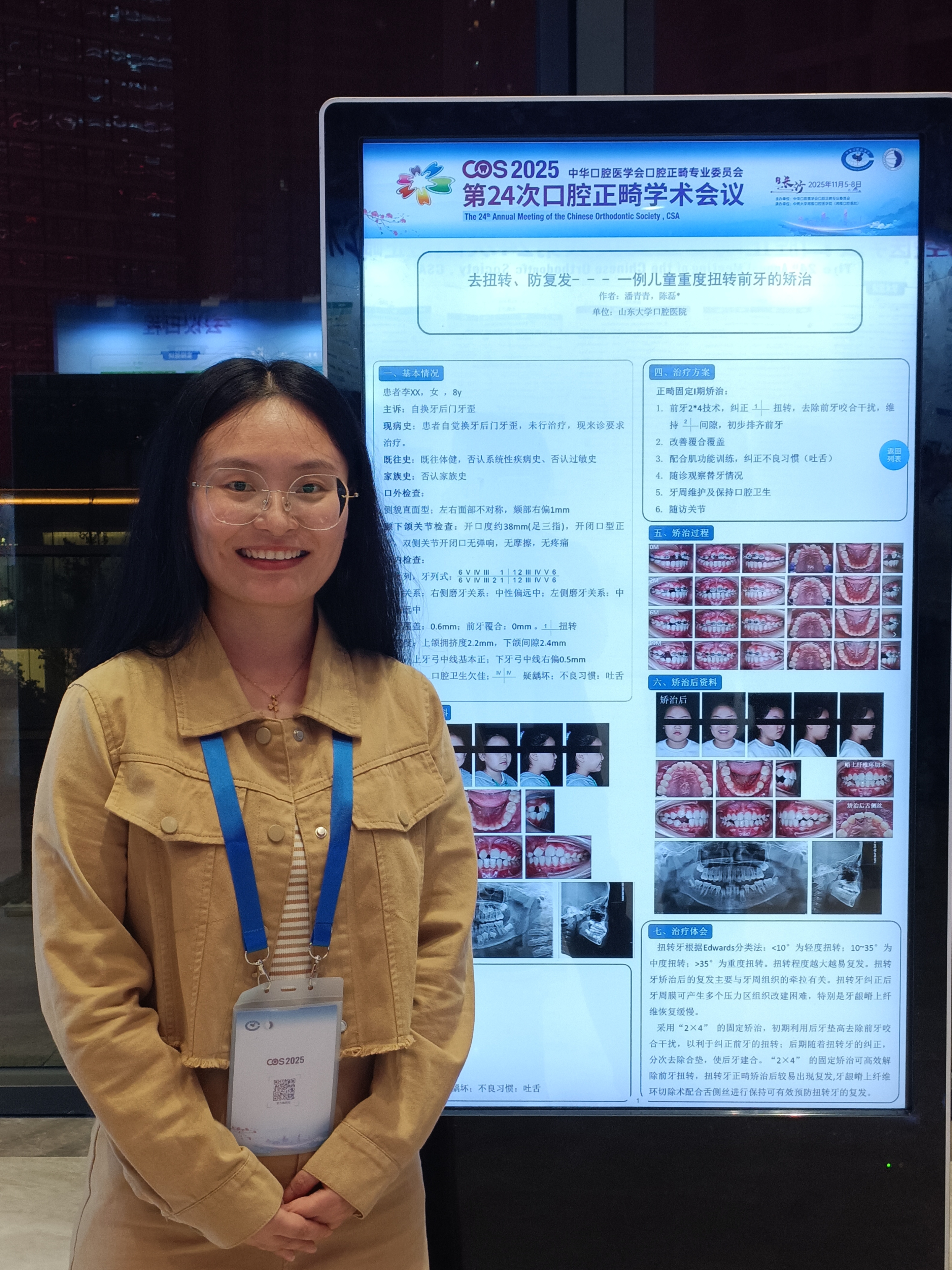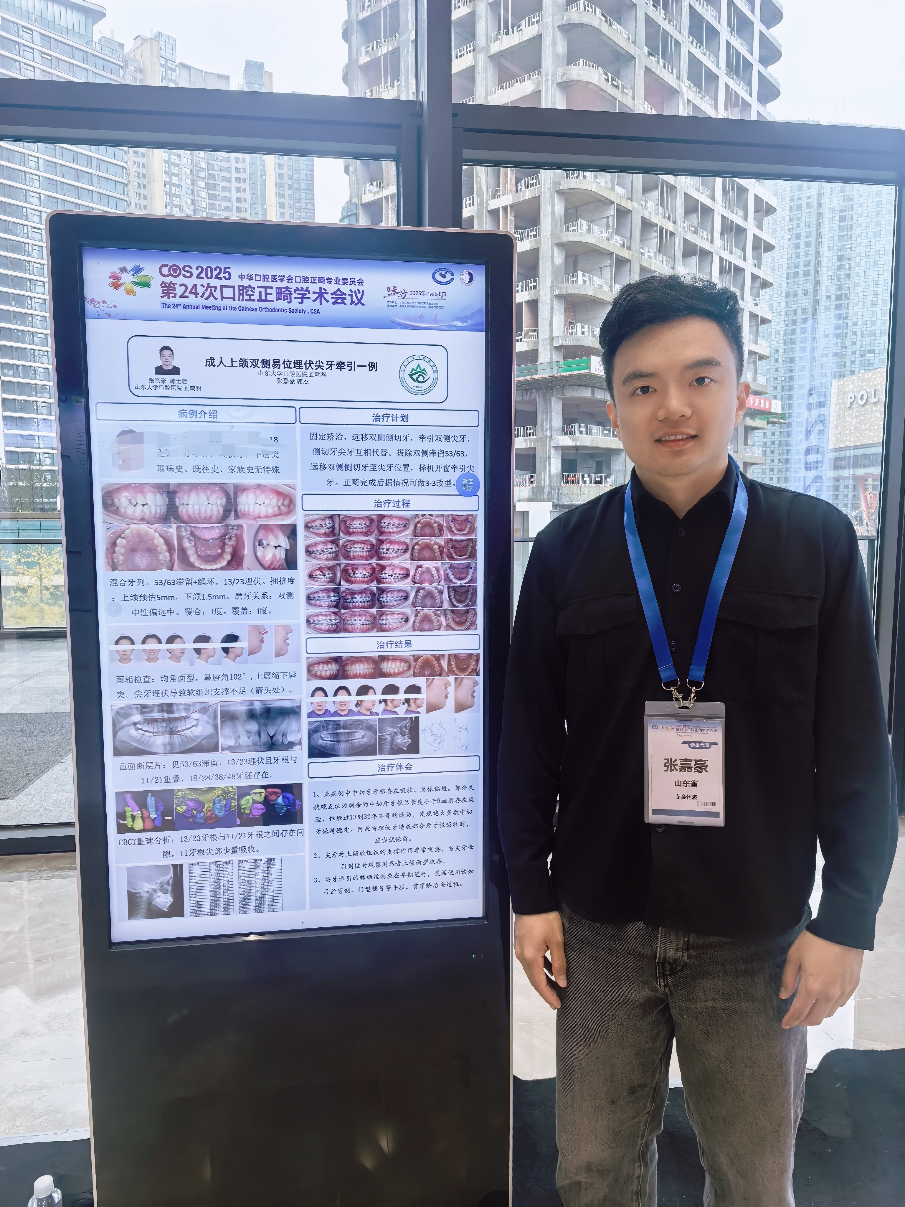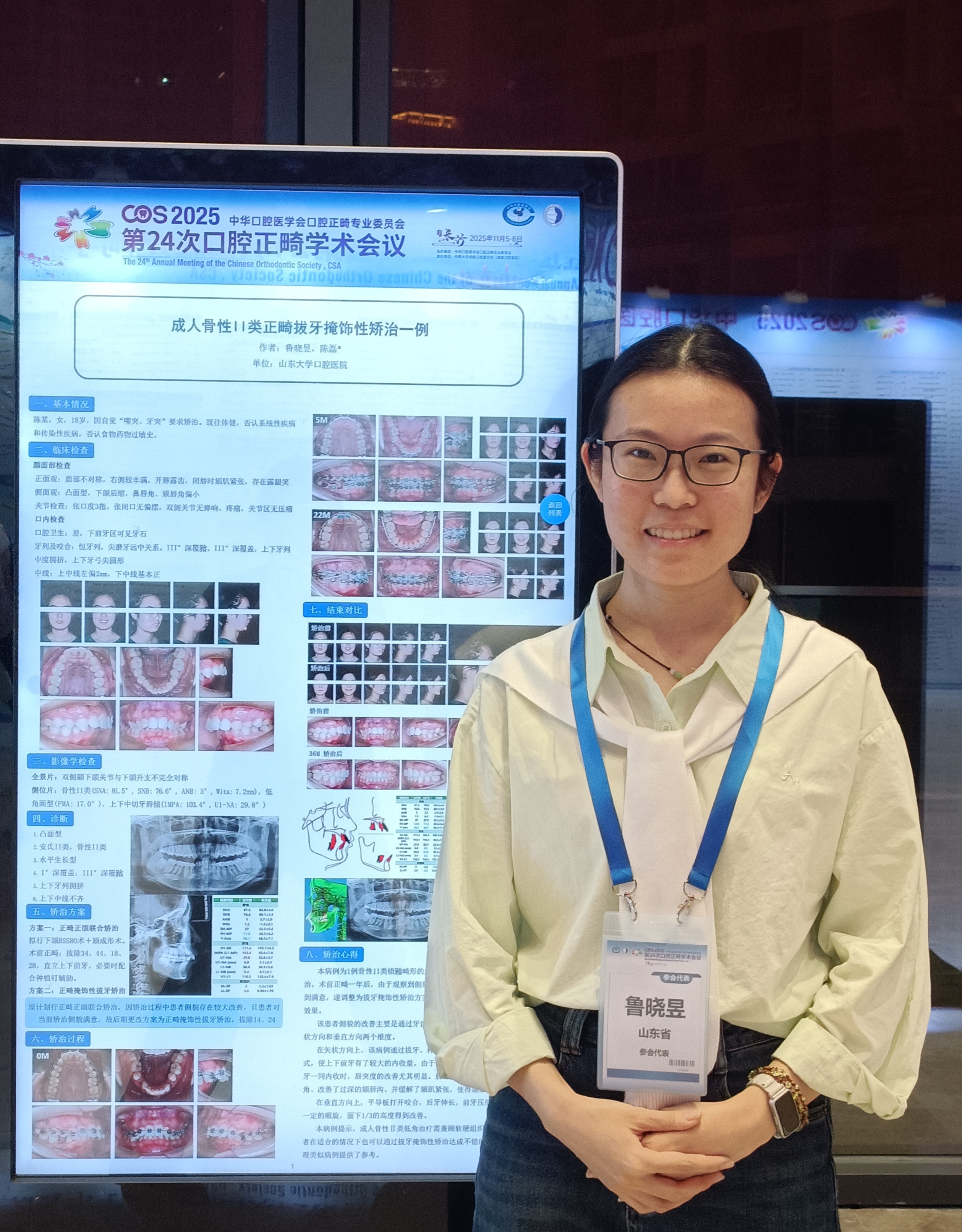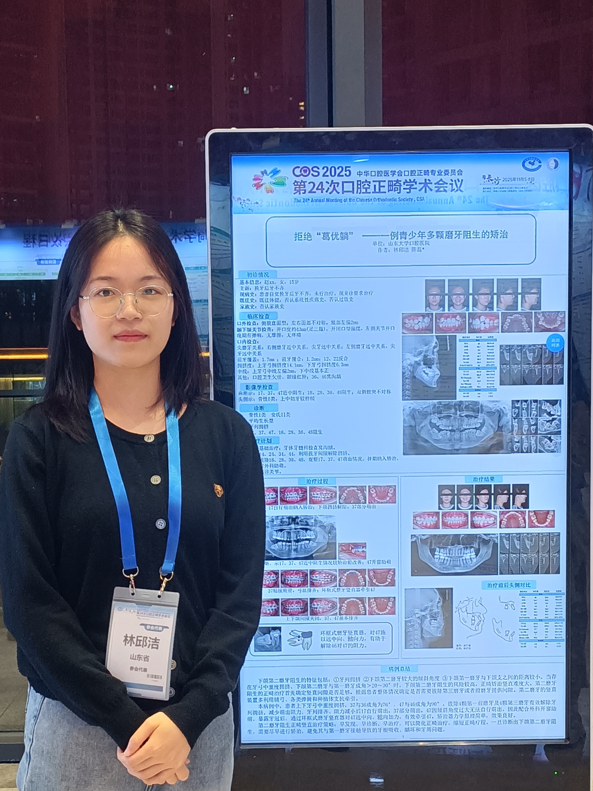 正畸科5名学生入选全国病例壁报展示,研究生崔晓彬(导师:张君教授)《前方牵引矫治器结合双丝法矫治儿童骨性III类伴上颌中切牙倒置阻生一例》;研究生鲁晓昱《成人骨性II类正畸拔牙掩饰性矫治一例》(导师:陈磊教授);研究生林邱洁《拒绝“葛优躺” --一例青少年多颗磨牙阻生的矫治》(导师:陈磊教授);住培生窦澜鑫《移花接木,微笑重启--正畸联合种植治疗成人牙列缺损一例》(导师:陈磊教授);进修生潘青青《去扭转、防复发--一例儿童重度扭转前牙的矫治》(导师:陈磊教授)。所展示的临床案例覆盖儿童早期矫治、成人复杂错颌、多学科联合治疗等多个领域,将诊断思路与治疗过程系统呈现,成为会场中备受关注的亮点。