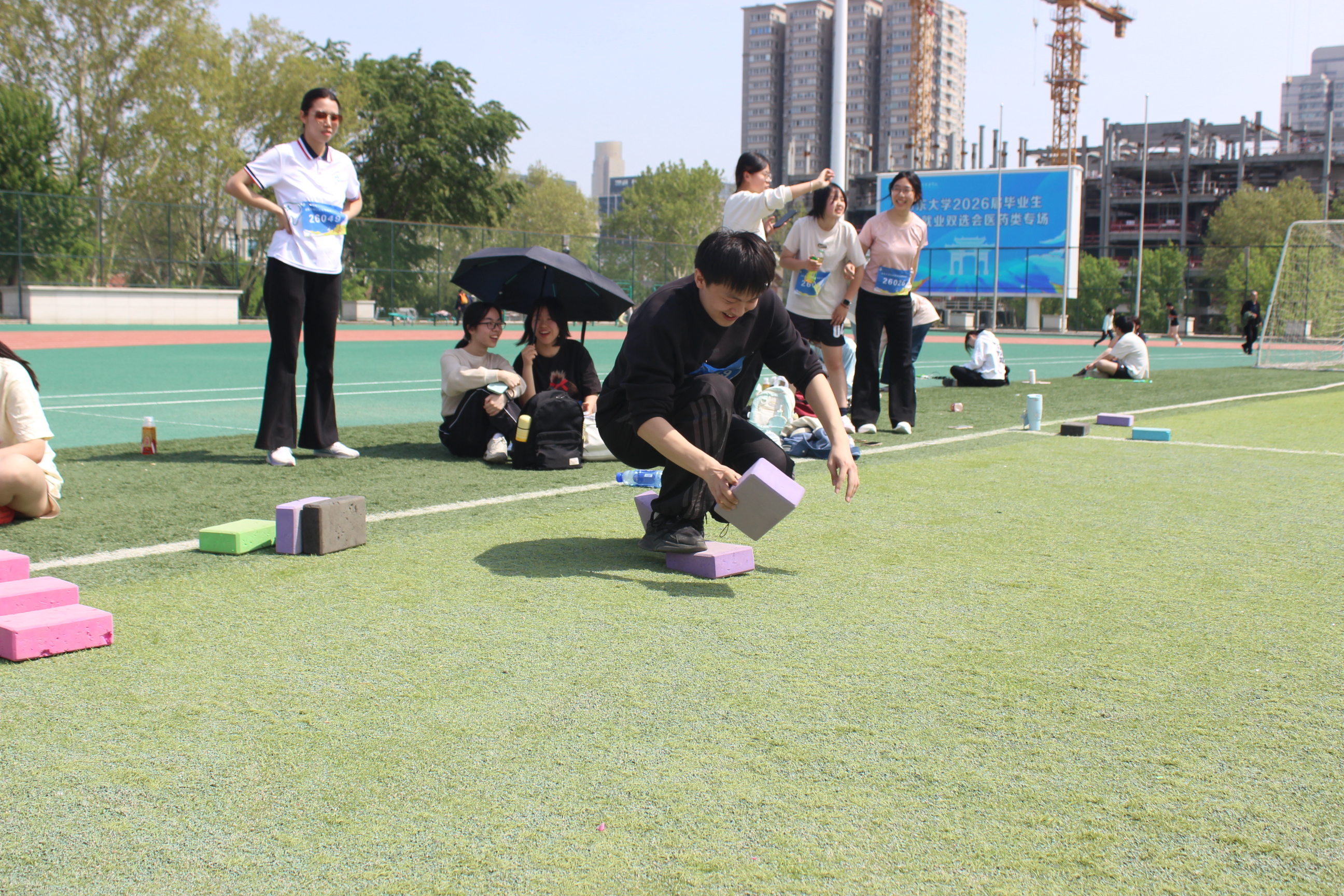 学院组织开展了集体热身活动,科学调动师生身体机能,确保赛事安全有序进行。随着赛事全面展开,赛场内外热潮涌动。竞技项目高潮迭起:短跑选手如离弦之箭,彰显速度之美;中长跑健儿坚持不懈,以耐力诠释医者韧性;4×100米接力赛中,队员们默契传接,凝聚团队力量,展现了敢闯敢拼、永不言弃的卓越风貌。趣味项目则别开生面:“搭石过河”考验协作平衡,“踢毽子”尽显灵动身姿,“沙包投掷”比拼精准技巧。这些项目将竞技与娱乐有机融合,有效缓解了比赛紧张氛围,让全体同学在轻松互动中增进了情谊,现场欢声笑语不断。
