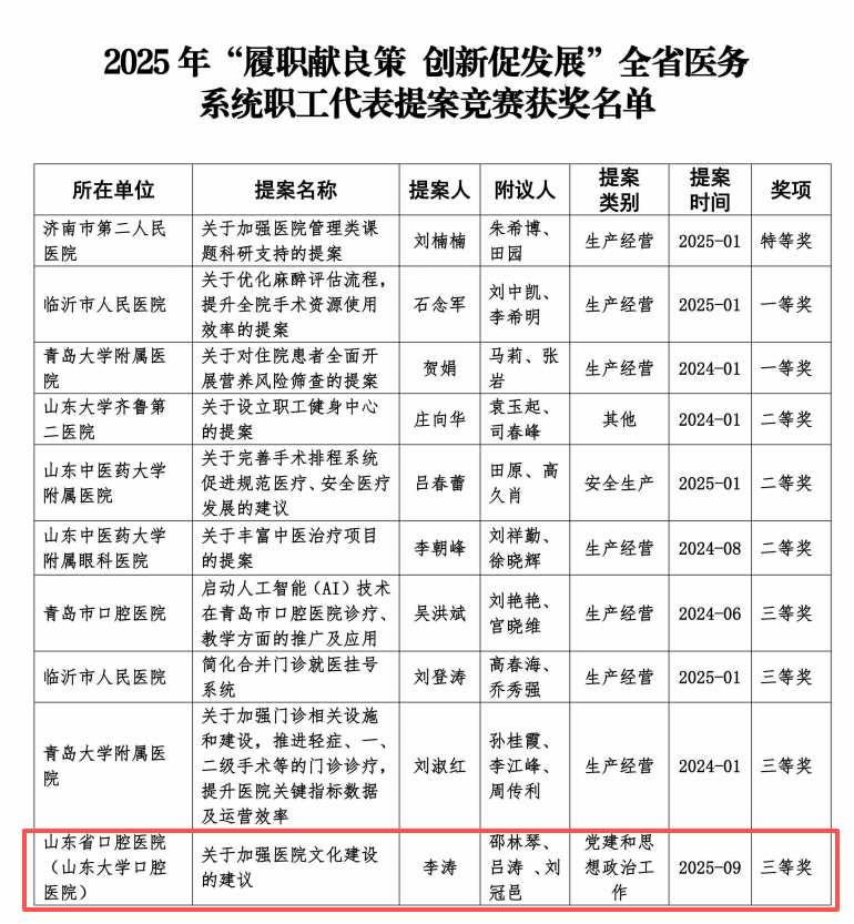 近日,山东省医务工会委员会陆续公布了2025年“履职献良策 创新促发展”全省医务系统职工代表提案竞赛及“鲁医创新杯”创新创效竞赛的成绩通报。山东大学口腔医院在两项赛事中均表现突出,成功斩获佳绩。