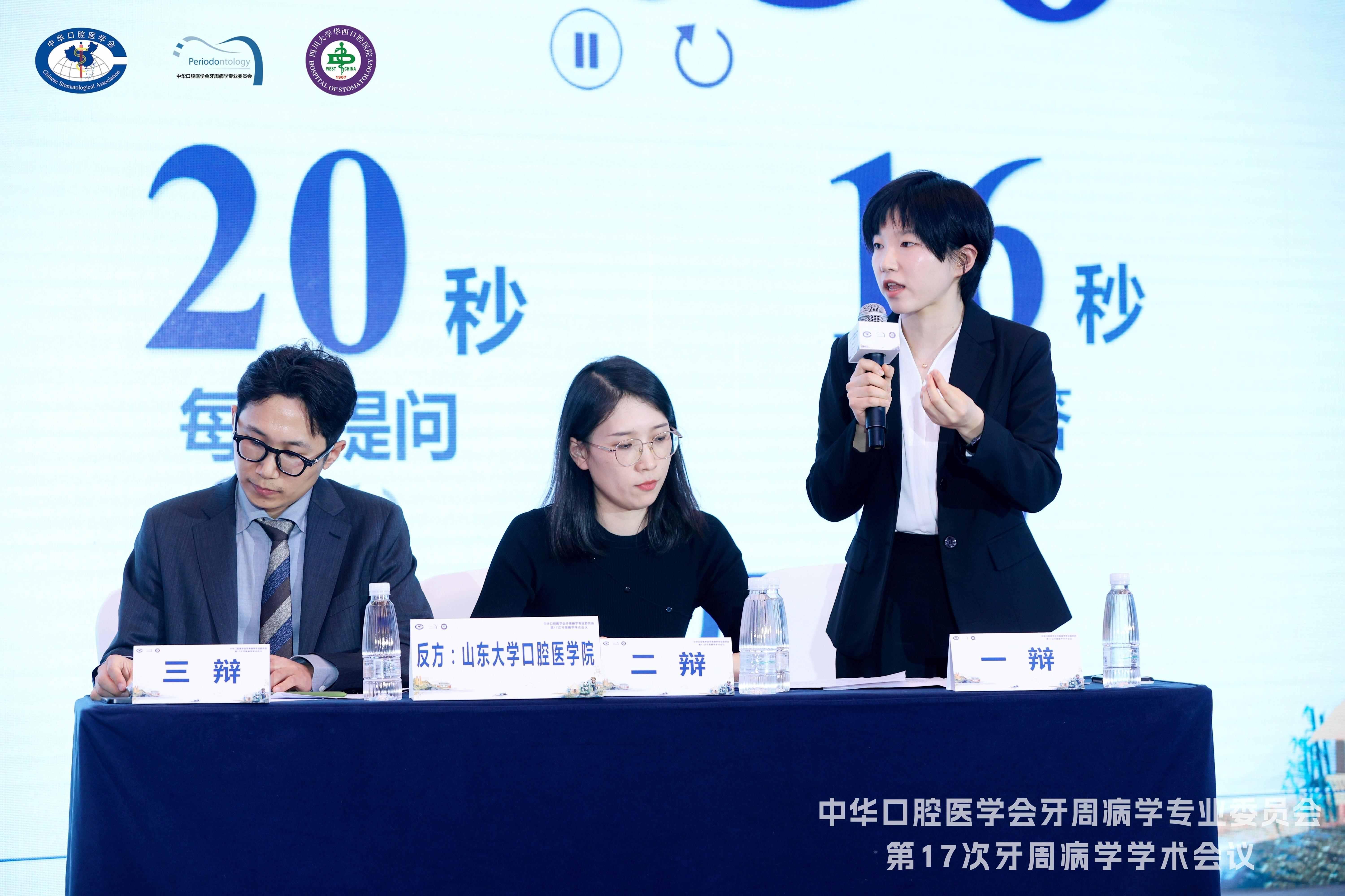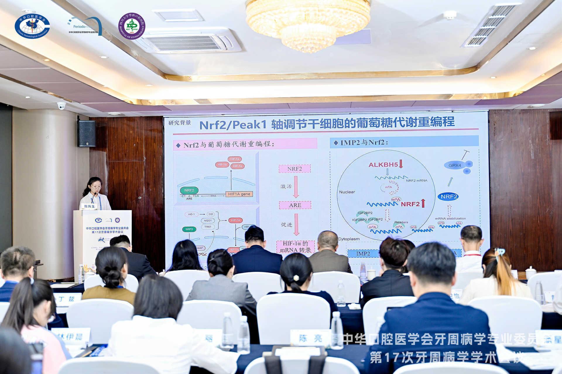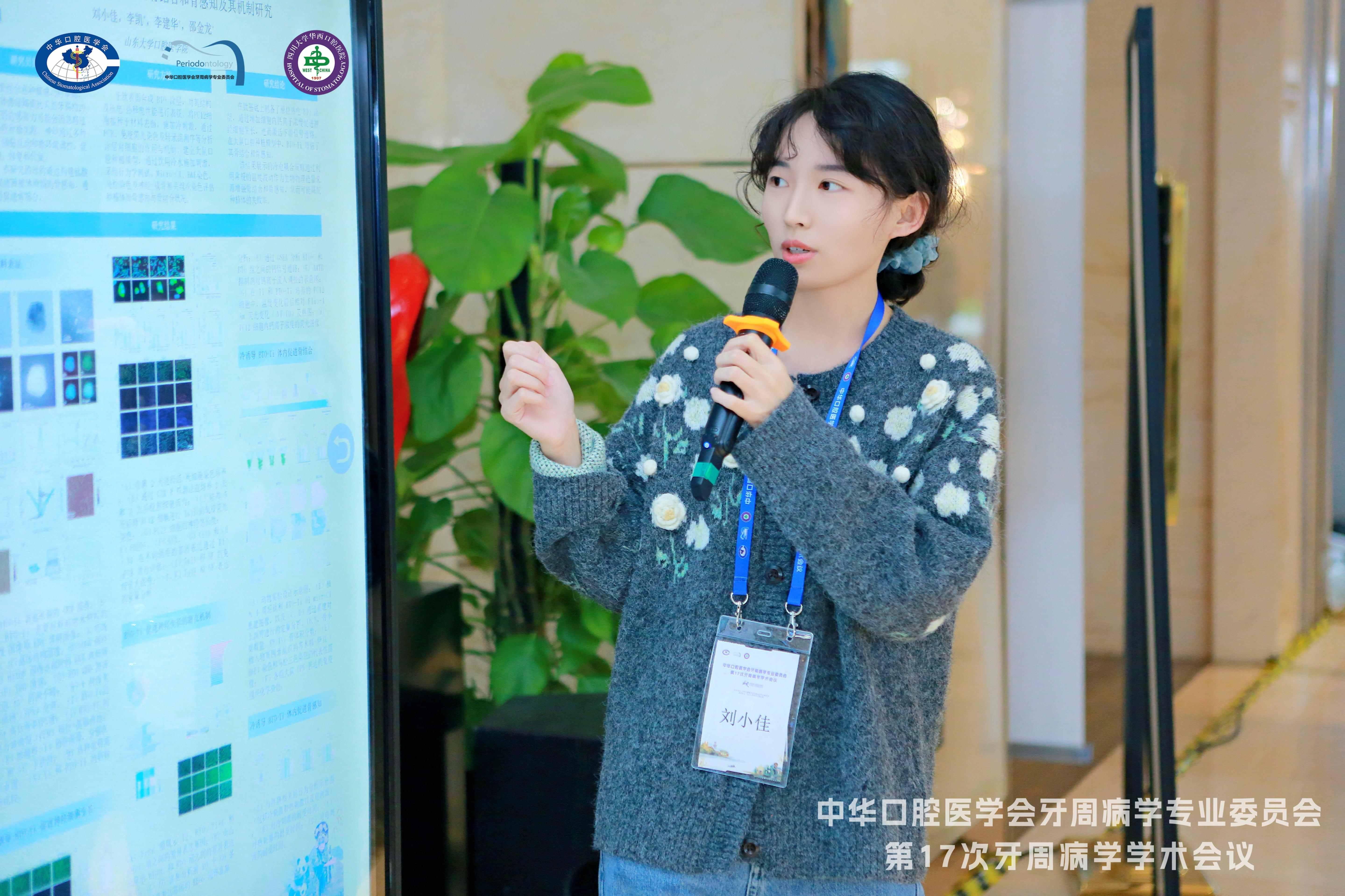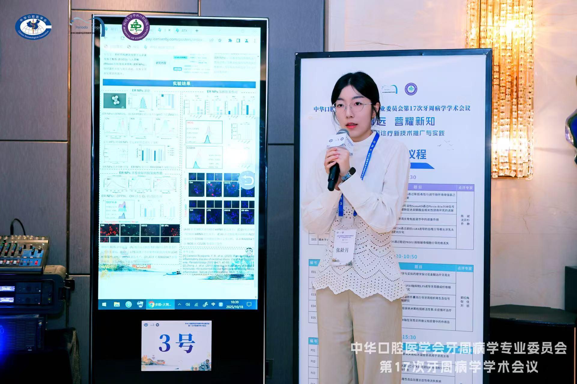 除此之外,张礼国、陈玮玉分别在牙周再生与基础研究专场、见微知著-牙周微生物与免疫进展前沿专场作了原位矿化屏障膜调控细胞衰老增强引导骨再生、IMP2促进牙周炎中PDLSCs葡萄糖代谢重编程影响其增殖分化的机制探究的口头汇报。韩菁、刘小佳、张龄月等则通过壁报展示了具有本征压电性的胶原支架增强骨再生的作用及机制研究、钛酸钡热释电促进种植体周骨感知和骨结合及其机制研究、多酚-大黄酸自组装纳米颗粒阻断活性氧-炎症循环治疗牙周炎等方面的前沿研究。张小岑、李柠、段小琪、李晓茜等多位医师的临床病例与科普作品,吴倩、张倩、井斐、张晓燕、王冬梅等护理人员的科普作品、护理视频、壁报等在现场进行了展示。