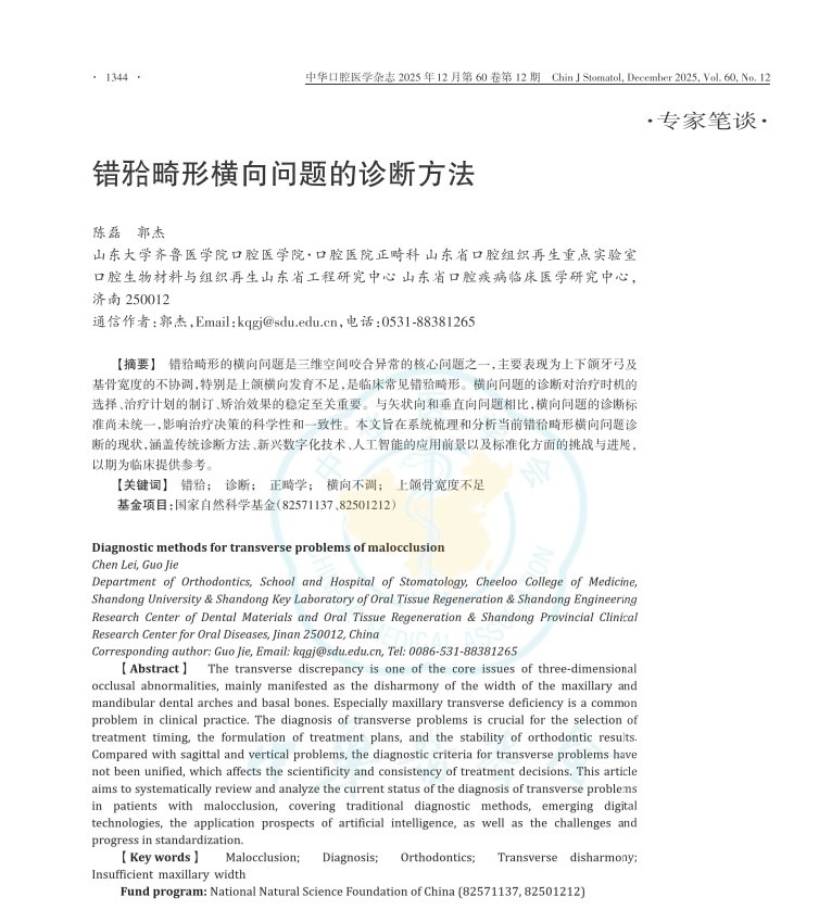 近日,山大口腔郭杰教授团队撰写的《错𬌗畸形横向问题的诊断方法》在中国口腔医学顶尖中文学术期刊《中华口腔医学杂志》“专家笔谈”栏目刊发,正畸科副主任陈磊为第一作者,郭杰为通信作者。