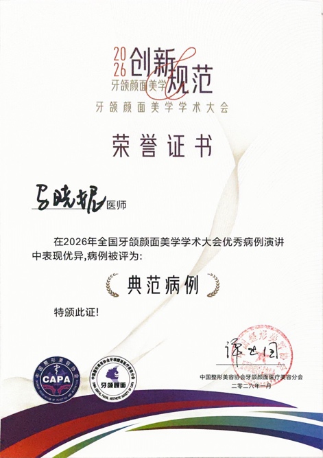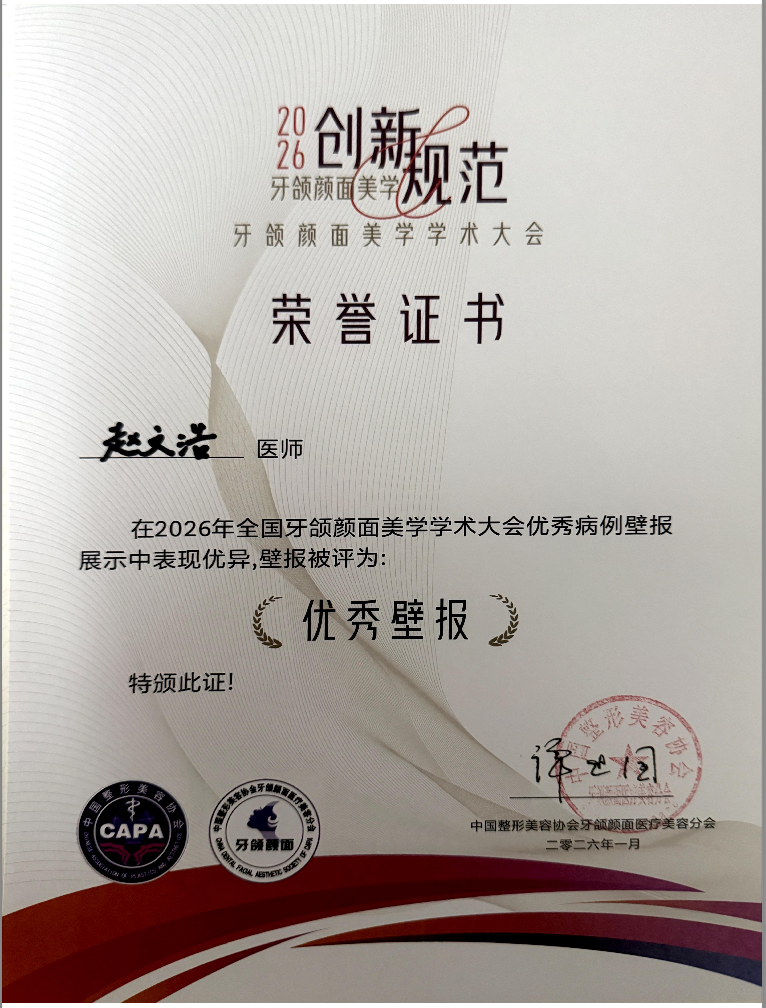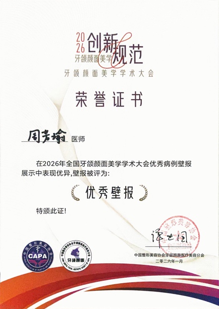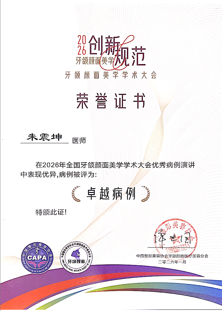 近日,由中国整形美容协会牙颌颜面医疗美容分会主办的2026牙颌颜面美学学术大会在北京顺利召开。首届全国牙颌颜面优秀病例展示活动同期举办,山大口腔种植科副主任朱震坤荣获优秀病例展示活动最高奖项—卓越病例奖。