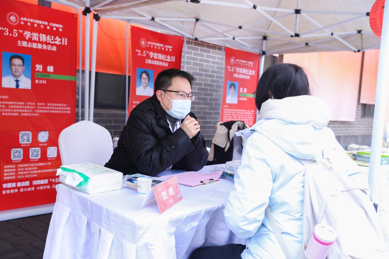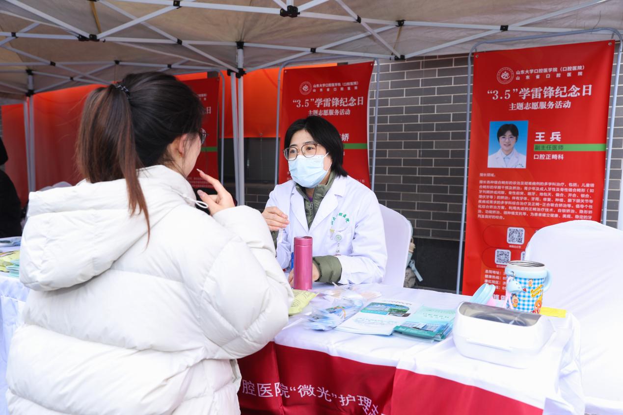 口腔健康义诊区,由急诊科主任刘峰、综合科于美娇、正畸科王兵等多科室医护人员组成的学雷锋义诊团队,耐心细致地为每一位前来咨询的师生提供免费口腔检查和专业健康指导。微光护理志愿服务队护士长严媛媛、山东大学学生微笑之光口腔爱心服务社则通过刷牙机、口腔模型演示等方式开展口腔卫生宣教,将专业口腔健康知识转化为通俗易懂的日常科普,用实际行动践行了服务师生学雷锋志愿服务精神。