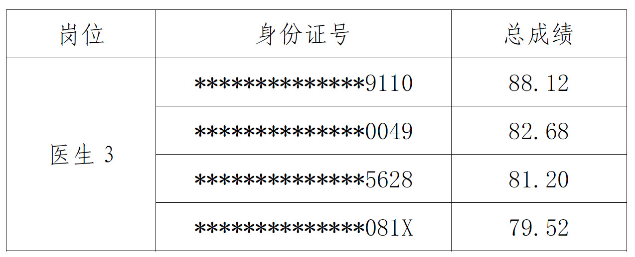 根据事业单位公开招聘有关规定,确定李德水(身份证号**************9110)为医生3岗位考察人选。